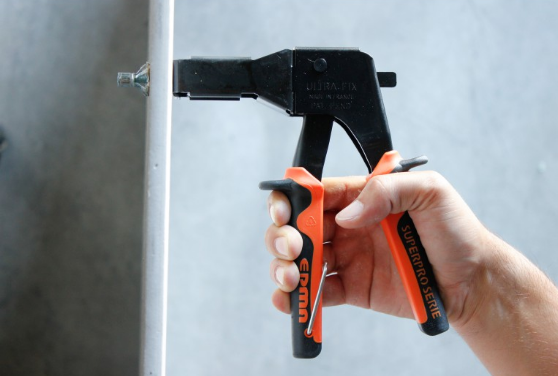 Pistolet d'expansion pour chevilles métalliques universelles Ultra Fix de Edma. Système à crémaillère à 5 crans. Spécial cheville Ø 8 mm sans effort. Course de tirage exceptionnelle de 30 mm. Déblocage aisé grâce à une poussée inverse de la poignée. Capacité max. : ø 8 mm.