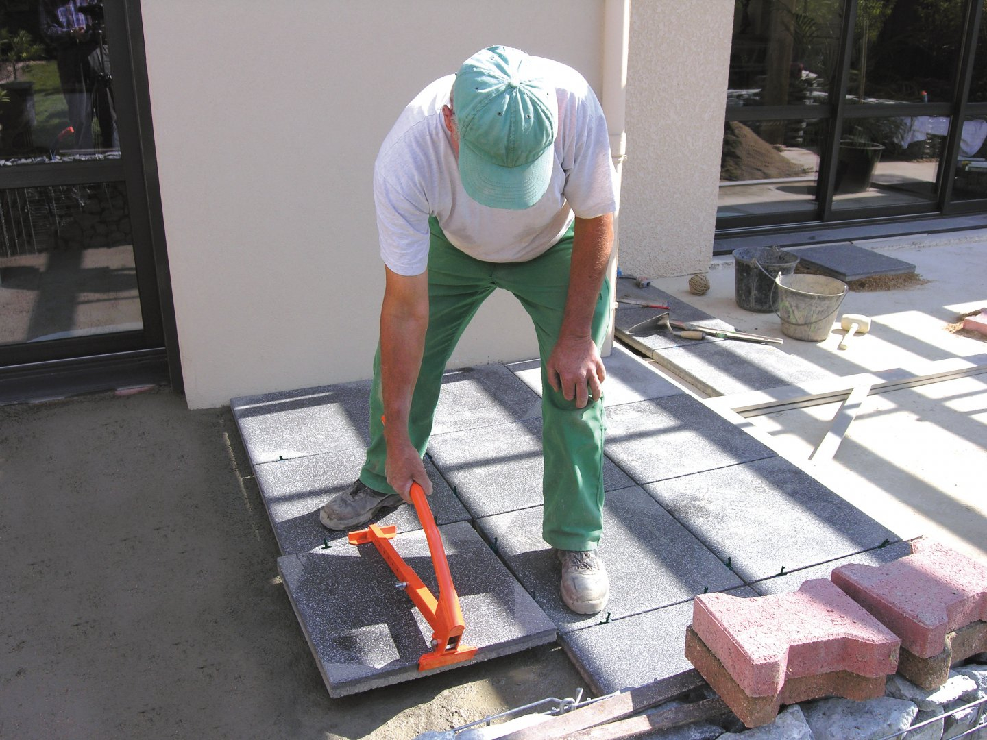 Pose dalles de Mondelin. Aide à la manutention des dalles : permet de déposer les dalles directement et précisément à leur emplacement, en toute sécurité. Réglage tous les 16 mm pour s’adapter à la dimension de la dalle Indexation fixe. Poignée ergonomique pour une meilleure prise en main. Charge utile 50 kg
