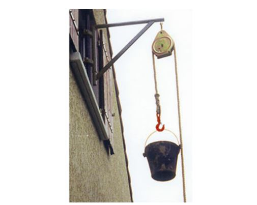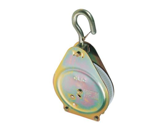 Poulie de renvoi à bras pour corde de Ø 20 à 26 mm (20/22 conseillé). Modèle CLIC (marque déposée). Finition anticorrosion par électro-zingage. La poulie CLIC permet le levage de tous types de matériaux de construction, éléments d'échafaudage,etc... Son système d'encliquetage permet de faire une pause (si nécessaire) au cours du levage de la charge, si la tension sur la corde s'arrête, un cliquet bloque le réa, la gorge trapézoïdale freine le glissement de la corde. Une nouvelle traction débloque le cliquet. Ceci constitue un élément de confort et de sécurité important par rapport à une poulie de renvoi ordinaire. C.M.U. de 100 kg (charge maximun de 50 kg). Diamètre extérieur du réa : 220 mm pour une bonne protection entre les flasques.