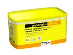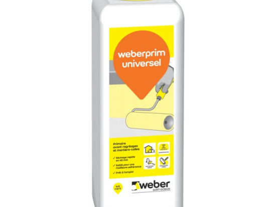 Le WEBERPRIM UNIVERSEL est une dispersion aqueuse de résine synthétique, souvent teintée (bleue ou verte) pour visualiser l'application. Son rôle est de réguler la porosité des supports très absorbants et d'assurer l'adhérence sur les supports lisses ou fermés, agissant comme un "pont d'adhérence".