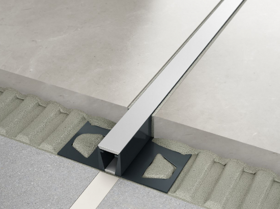 - Noyer l'ailette de fixation à perforations trapézoïdales du profilé Dilex BWB dans le lit de mortier-colle et l'aligner. Le profilé doit être positionné au-dessus du joint de fractionnement du support