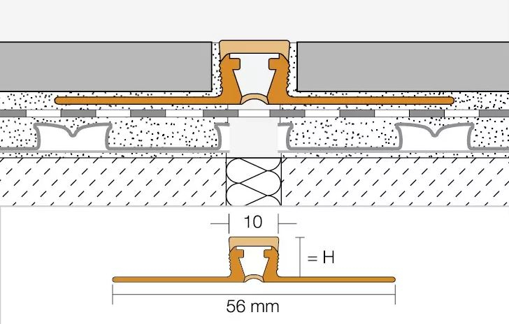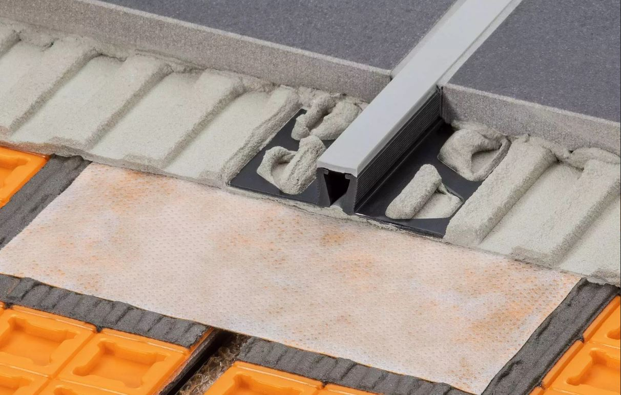 Les ailettes de fixation à perforations trapézoïdales en PVC dur recyclé s’ancrent dans le mortier-colle, sous les carreaux, et transmettent les mouvements vers l’élément central en CPE souple.