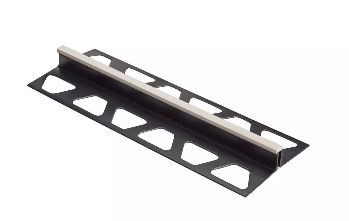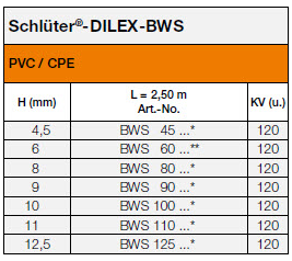 Schlüter dilex BWS est un profilé de fractionnement en matériaux synthétiques, destiné à être utilisé avec des revêtements carrelés. Les ailettes de fixation à perforations trapézoïdales en PVC dur recyclé s’ancrent dans le mortier-colle, sous les carreaux, et transmettent les mouvements vers l’élément central en CPE souple.