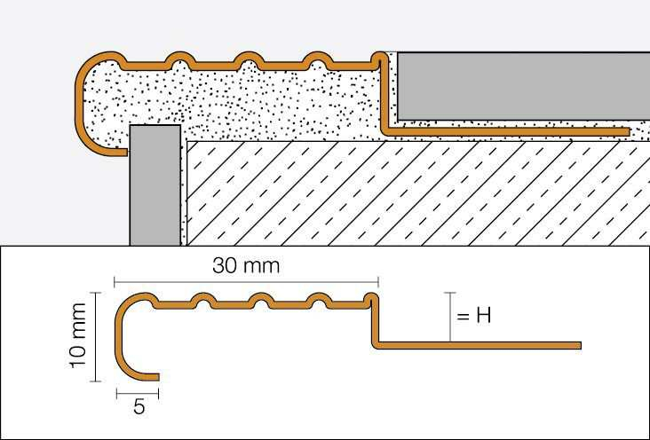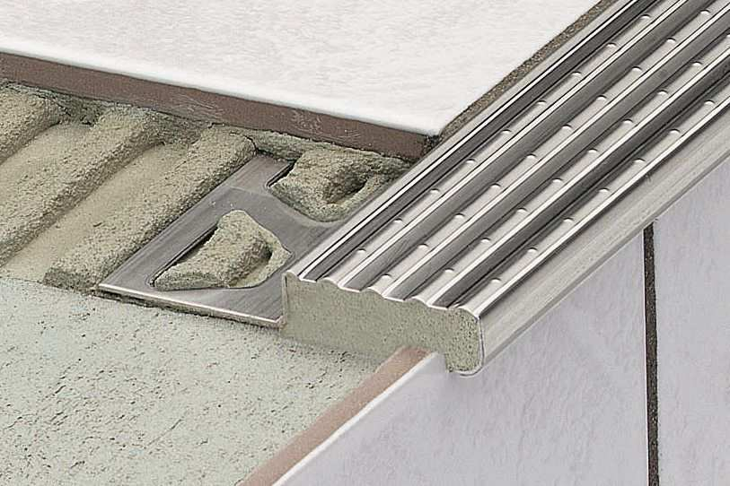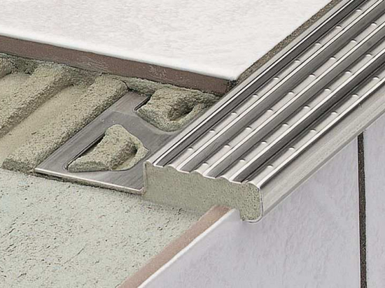 Il peut s’utiliser pour tout type de revêtement (revêtement carrelé, en pierre naturelle, en ciment, etc.). Ce profilé convient particulièrement pour des sollicitations élevées dans les locaux collectifs (surfaces commerciales, bâtiments publics, etc.). Schlüter®-TREP-E protège le nez des marches et garantit un niveau de sécurité élevé grâce à ses propriétés non-glissantes (certificat de test BIA, antiglissance - groupe d’évaluation R10V6) et à son excellente visibilité. Des capuchons de fermeture font également partie de la gamme.