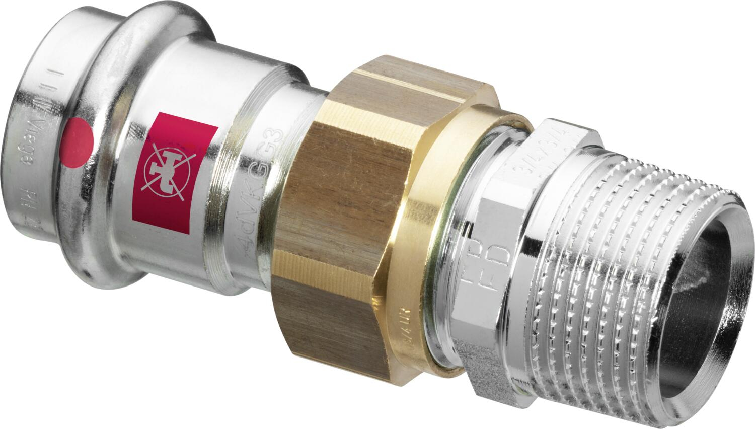 Prestabo-Raccord démontable de transition avec SC‑Contur | 3 pièces MF | acier non allié, galvanisé | raccord à sertir, filetage R | à joint plat | Joint plat EPDM, joint EPDM, six pans