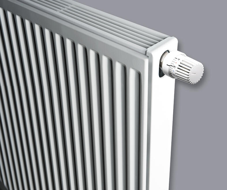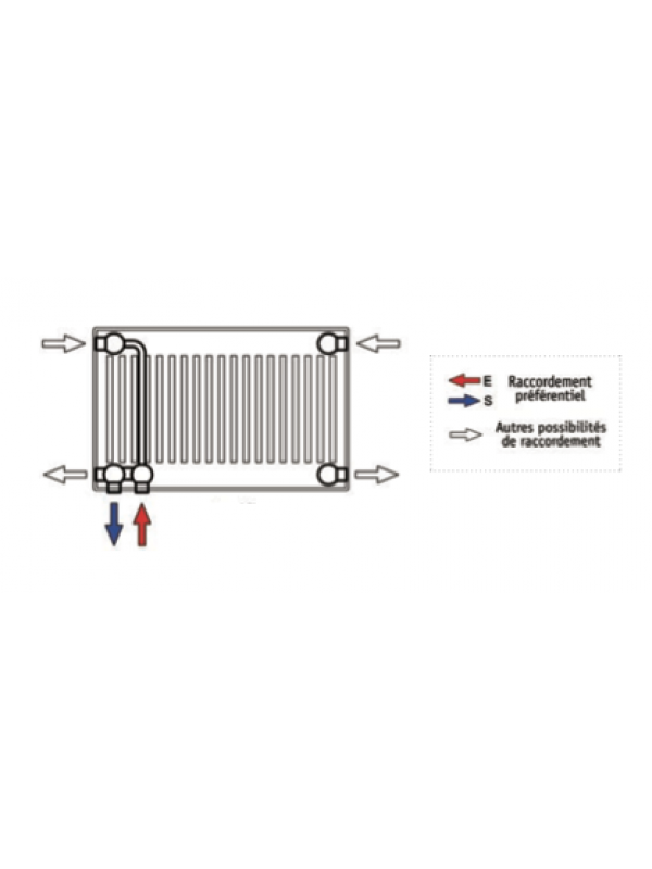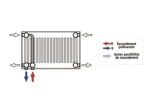 Radiateur à vanne avec raccordement en bas et 4 raccords latéraux. La console en J permet d’inverser le radiateur au montage afin de monter le bouton du thermostat à gauche ou à droite (à l'exception du type 11).