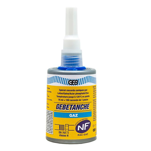 Résine Gebetanche gaz. Application : S'utilise sur raccords filetés coniques sur les canalisations transportant les gaz combustibles butane, propane, gaz naturel. - Compatible avec les métaux suivants : laiton, acier galvanisé, phosphaté-zingé et acier inoxydable. Avantages produits : Démontable sans chauffer sur des raccords de 1/2 pouce. - Remise en pression immédiate jusque 3 bars. - Sans utilisation de filasse. Label et agrément : NF RAC-GAZ attribuée par CERTIGAZ Norme EN 751-1 classe H Mode d'emploi : Travailler sur des raccords propres, dégraissés et séchés. - Déposer le produit sur toute la circonférence des 4 premiers filets mâles (au minimum). - Lisser avec l'embout applicateur ou au doigt. - Assembler et serrer. Ne pas repositionner.
