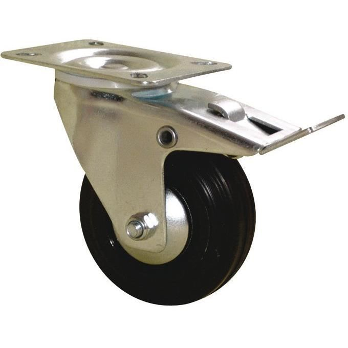 Monture: tôle d'acier emboutie zinguée Pivotement sur une couronne de billes pour le diamètres 50 et 65 mm Pivotement sur deux couronnes de billes Double blocage (roue et pivot) Fixation à platine Bandage caoutchouc standard noir Corps de roue en prolypropylène noir Moyeu lisse pour le diamètre 50 et 65 mm ou roulement à rouleaux, avec pare-fils