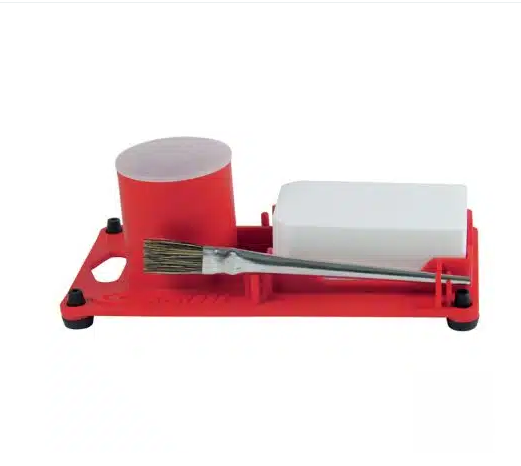 Support pour pierre et décapant avec pinceau 9640 Guilbert Express. Spécialement conçue pour la couverture et la zinguerie, cette nouvelle platine reçoit une pierre ammoniacale plus épaisse de 5 mm et bien dégagée de la cavité qui est utilisée pour décaper et pour nettoyer les pannes de fers à souder ainsi qu’un pinceau et réserve un emplacement spécifique pour le flux.