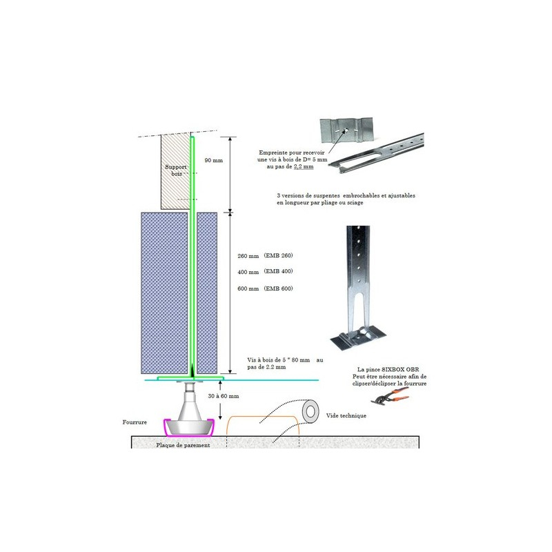 Nos suspentes EMB 260 – EMB 400 – EMB 600 vous permettent de fixer les rails / fourrures qui recevront vos plaques de parement intérieur (plaque de plâtre, Fermacell ) sans détériorer votre pare vapeur pour les planchers , sous toitures et rampants .Ils facilitent la création d'une lame d'air entre votre plafond support et vos plaques de plâtres pour passer vos gaines électriques et techniques.Composé de deux parties à assembler, la tête qui recevra votre appui ou suspente et le corps de la suspente à fixer à selon votre hauteur souhaitée. Ces suspentes embrochables , sont ajustable en longueur par pliage ou sciage . Ils peuvent être associés à des entretoises pour augmenter votre vide technique ou pour faire face à une contrainte technique.. Elles se fixent sur pan , poutres , solives , chevrons etc …