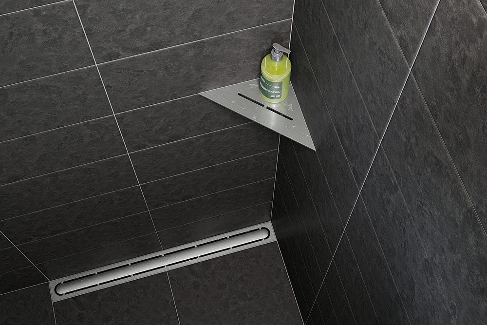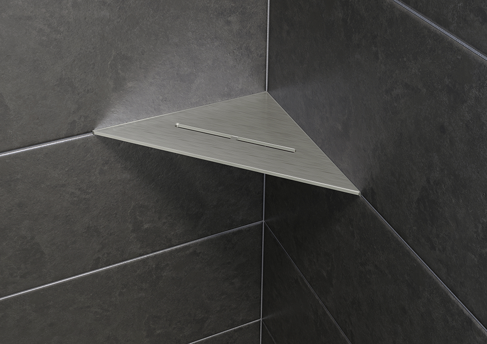 Schlüter-SHELF-E sont des tablettes d’angle, disponibles en trois formes différentes.