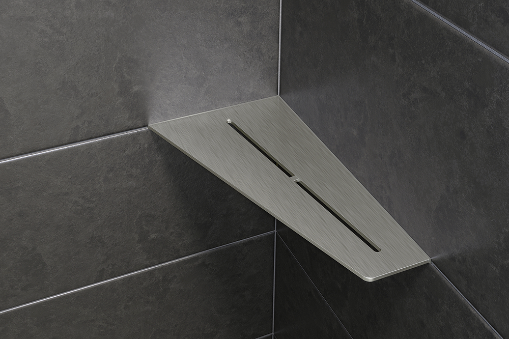 Schlüter-SHELF-E sont des tablettes d’angle, disponibles en trois formes différentes.