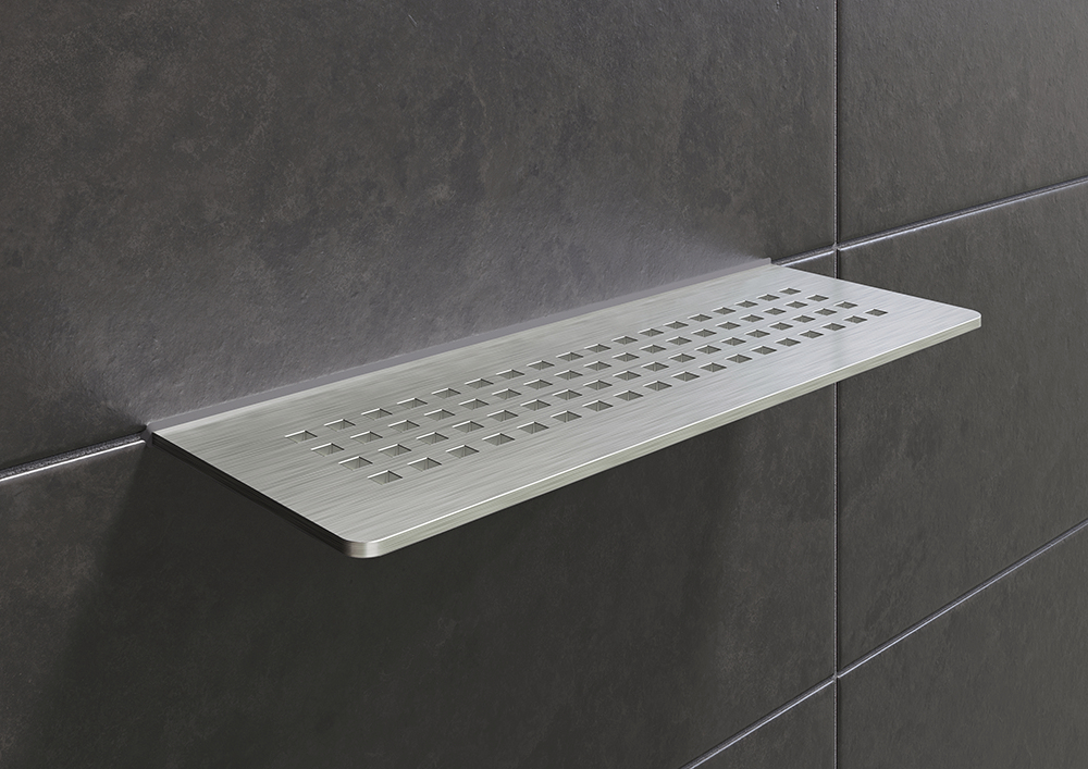 La tablette rectangulaire Schlüter-SHELF-W s’intègre dans le mur lors de la pose des carreaux, qui recouvrent intégralement ses ailes de fixation. La tablette supporte ainsi un poids important. Comme toutes les tablettes Schlüter-SHELF, elle se monte sans perçage et se caractérise par la sobriété de son design.