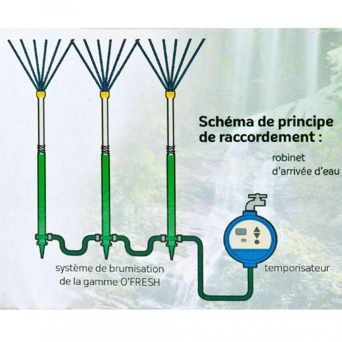 Le temporisateur de brumisateur permet de le faire fonctionner par intermittence (réglable à la seconde près). Se branche entre le tuyau d'arrosage et le brumisateur. Assure une brumisation rafraîchissante et intermittente. Peut s'utiliser comme un programmateur d'arrosage classique. Fonctionne avec tous les produits de la gamme O'Fresh. Pince attaches rapides. Ecran LCD
