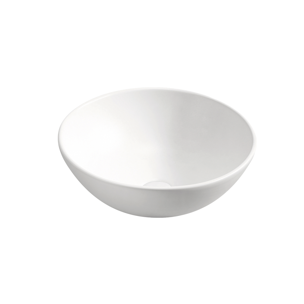 Vasque à poser cocoon en céramique ronde livrée sans trop-plein et sans bonde.