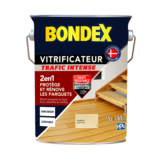 Système Bondex: 3/4 couches de Bondex Vitrificateur Pièces à vivre. Attendre deux à trois semaines avant la sollicitation du parquet, la remise en place des meubles et des tapis. Les temps de séchage des produits sur certains chantiers effectués en saison hivernale peuvent être plus longs que les temps annoncés. L'application accidentelle de couches trop épaisses peut entrainer un ralentissement du temps de séchage.